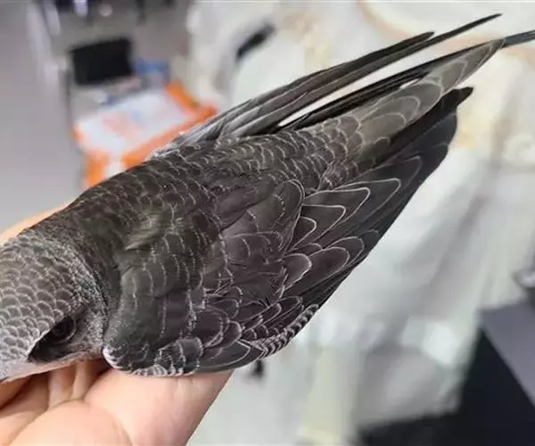 普通楼燕头和上体黑褐色,头顶和背羽色较深暗,并略具光泽。两翅狭长,呈镰刀状,两翅初级飞羽外侧和尾表面微具铜绿色光泽。尾叉状。颏、喉灰白色,微具淡褐色纤细羽干纹。胸、腹和尾下覆羽黑褐色,腹微具窄的灰白色羽缘。虹膜暗褐色,嘴短阔而平扁,纯黑色,脚黑褐色。