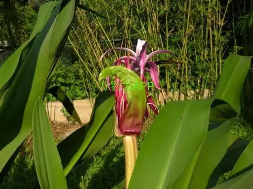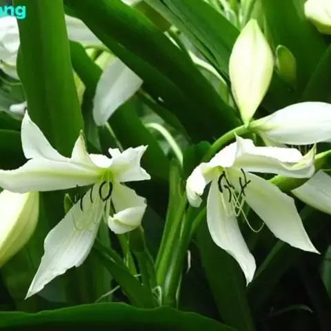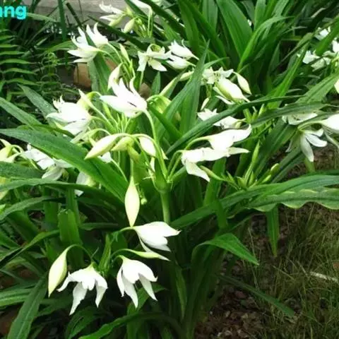 多年生粗壮草本。叶带形,长70厘米或更长,宽3.5-6厘米或更宽。伞形花序有花数朵至10余朵,下有佛焰苞状总苞片2枚,披针形,长约9厘米,小苞片多数,线形;花梗很短;花被近漏斗状的高脚碟状;花被管长约9厘米,常稍弯曲;花被裂片披针形或长圆状披针形,长约7.5厘米,宽约1.5厘米,顶端短渐尖,白色,有红晕;雄蕊6,花丝短于花被,花药线形,长1.2-1.8厘米。花期6-8月。