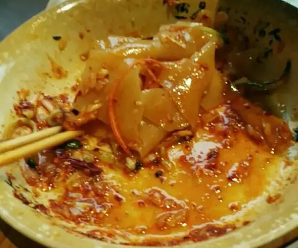 ④热食时汉中面皮切得较宽,而关中、河南等地的凉皮没有热食的习惯普遍较细窄。