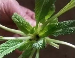叶对生长椭圆形,长3-5cm,灰绿色,叶表有凹凸状织纹,且有折皱,灰白色,香味刺鼻浓郁。