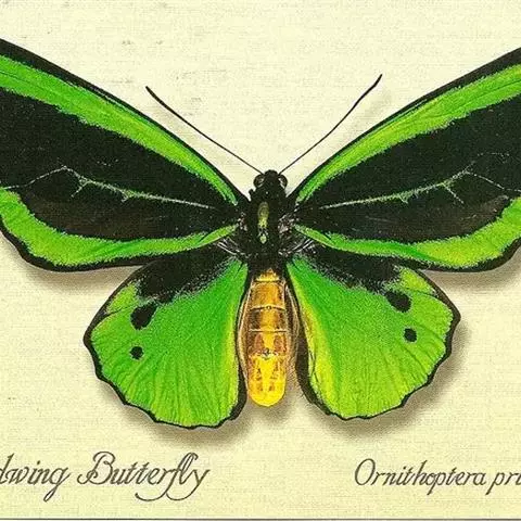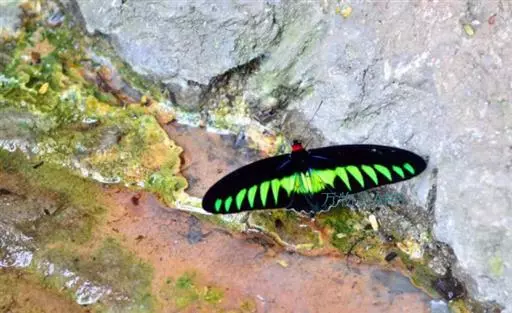 红鸟翼凤蝶(图1-雄蝶) 色,腹部黄色,胸部局部有红色的绒毛;前翅呈褐色(某些亚种为白色),有白色不规则斑点,后翅黑褐色(某些亚种为白色),有金色不规则斑点链。雄蝶翼展约17厘米,体长约8厘米。较为细小,前胸黑色,腹部金黄色;前翅呈黑色,上半部分橘红和绿色带,有光泽,后翅边缘黑色,内侧有绒毛,布有大片黄、绿色带,有黑色斑点链和脉纹,背面则是黑色和黄绿色,并布有黑色斑点链和条纹。