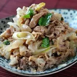2. 将五花肉洗干净,切成薄片,葱、姜切成末,待用。