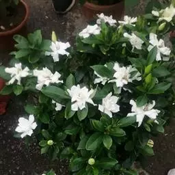 栀子花,花朵簇状约30枚瓣,奶油色,中心黄色;花径12cm;气味果香.