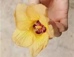 花单生于叶腋间,花梗长1-2厘米,疏被糙硬毛;小苞片8-10,线形,长约1.5厘米,疏被硬毛;花萼钟形,较长于小苞片,密被星状短绒毛;花黄色,内面基部紫色,直径5-7厘米,花瓣倒卵形,长4-5厘米。