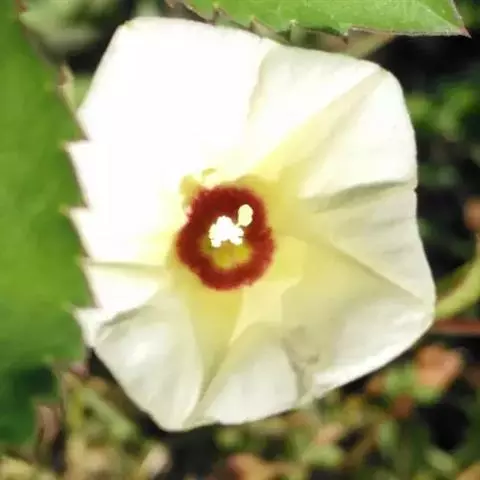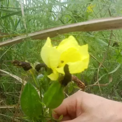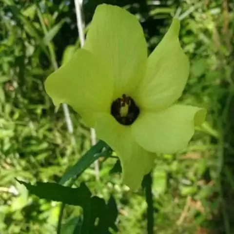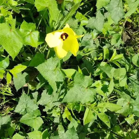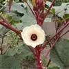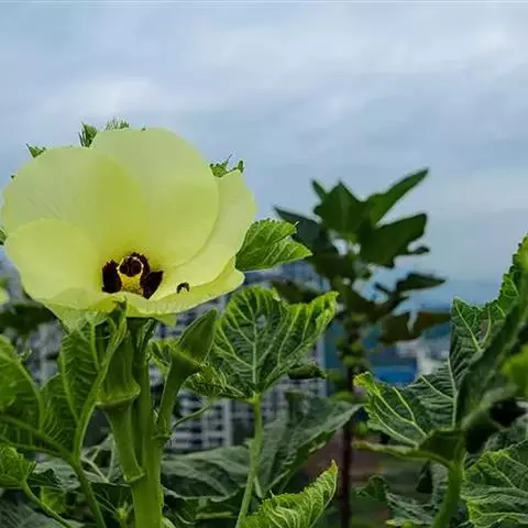 咖啡黄葵(学名:Abelmoschus esculentus (Linn.)Moench)亦称黄秋葵,锦葵科一年生草本植物。茎圆柱形,疏生散刺。叶掌状,裂片阔至狭,托叶线形,被疏硬毛。花单生于叶腋间,花梗疏被糙硬毛,小苞片钟形;花萼钟形,密被星状短绒毛;花黄色,内面基部紫色,蒴果筒状尖塔形,种子球形,具毛脉纹。花期5-9月。