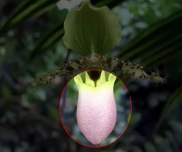 花葶直立,长10-24厘米,黄绿色,有紫色斑点和较密的长柔毛,顶端生1花;花苞片近椭圆形,长4-5厘米,宽2-2.5厘米,围抱子房,除背面中脉近基部处具长柔毛外余均无毛;花梗和子房长4-5厘米,密被紫褐色长柔毛;花大;中萼片中央紫栗色而有白色或黄绿色边缘,合萼片淡黄绿色,花瓣具紫褐色中脉,中脉的一侧(上侧)为淡紫褐色,另一侧(下侧)色较淡或呈淡黄褐色,唇瓣亮褐黄色而略有暗色脉纹;中萼片倒卵形至宽倒卵状椭圆形,长4.5-6厘米,宽3-3.8厘米,先端钝,基部收狭,边缘具缘毛,基部边缘向后弯卷;合萼片卵形,长3.8-5厘米,宽1.7-2.2厘米,亦具类似的缘毛;花瓣倒卵状匙形,长5-6.5厘米,上部宽2.5-2.8厘米,先端钝,边缘波状并有缘毛,基部明显收狭成爪并在内表面有少量紫褐色长柔毛;唇瓣倒盔状,基部有宽阔的,长2-2.5厘米的柄;囊近椭圆状圆锥形,长2.5-3.2厘米,宽2-3厘米,囊口极宽阔,两侧各有1个直立的耳,两耳前方边缘不内折,囊底有毛;退化雄蕊椭圆状倒卵形,长1-1.5厘米,宽7-10毫米,先端近截形而略有凹缺,基部有耳,中央具脐状突起,脐状突起上有时具不明显的小疣。花期11月至次年3月。