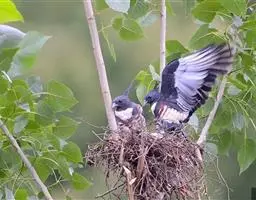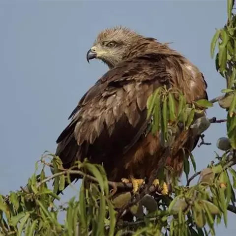 红鸢(图6) 交配期在3月底前或4月初,雌雄共同飞往巢区,通常选择和草原接壤的林地。有时两个伙伴抱住对方旋转,再打开翅膀追逐。夫妻共同搭建设一个杯形的新巢,有时也重新使用一些往年或乌鸦的旧巢。巢通常建在树上,离地面12-15米的高度。巢可能非常大,用短树枝干构筑,内部衬干燥的草和羽毛。平均每巢产4枚白色光泽的卵,上有红色或紫色斑点。孵化由雌鸟担纲,雄鸟偶尔更换很短的时间。孵化需31-32天,最多38天。