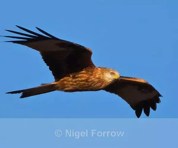 红鸢是比较典型的鸢,身长60-66厘米,翼展145-165厘米,雌鸟体重950-1300克,雄鸟体重750-1050克,寿命26年。头部具有白色的纵条纹和红棕色的羽毛,有红色的喙,鱼鳞状的羽毛叠成漂亮的翅膀,常成群作低空飞行。寻找猎物时,局部弯曲翅膀,尾部像船舵般经常使身体保持倾斜。狭长的翅膀展开以后有一定的角度。尾巴分叉呈锯齿状。从下面看,红鸢的翅膀下有一个白色的“手”。胸部和腹部有红褐色斑块和黑色细条纹。嘴、眼睛周围和腿根部是黄色;虹膜琥珀色;视力是人类的近8倍。