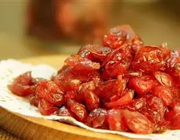 辅料:山楂糕20克、黄瓜皮25克、西红柿25克;淀粉50克、白糖20克;