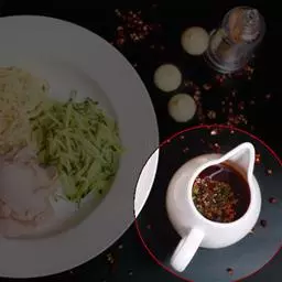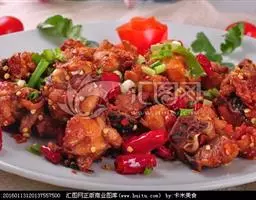 雏母鸡1只(重1000 g左右),开膛洗净后剁成5 cm见方的块。杏仁100 g用温水泡透,去掉外皮。将鸡块下入热花生油(500 g,实耗75 g)中炸呈金黄色。
