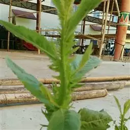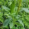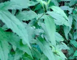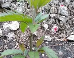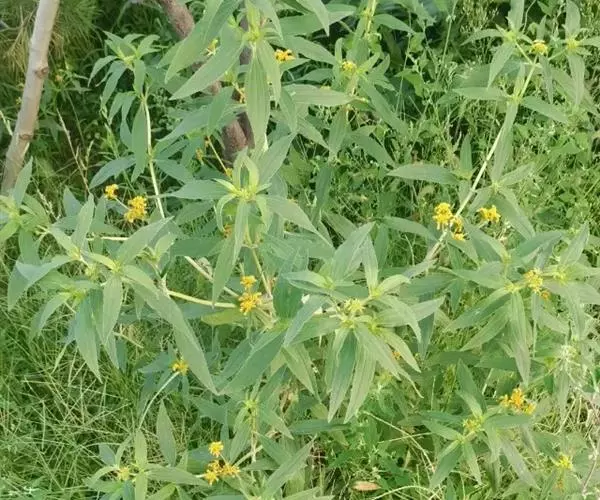 黄顶菊为一年生草本植物。植株高低差异很大,株高20-100厘米,条件适应的地段株高可达180-250厘米,最高的可达到3米左右。茎直立、紫色,茎上带短绒毛。叶子交互对生,长椭园形,长6-18厘米、宽2.5-4厘米,叶边缘有稀疏而整齐的锯齿,基部生3条平行叶脉。
