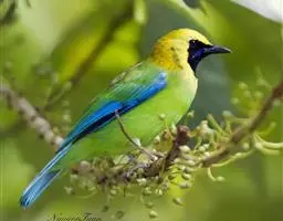 蓝翅叶鹎:小型鸟类,体长15-18厘米。雄鸟通体草绿色,尾蓝绿色,肩和翅亮蓝 色,胸缀有黄色,…