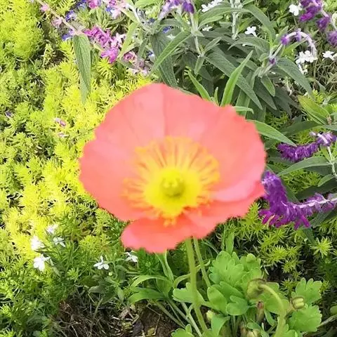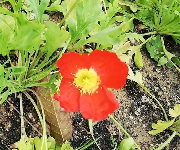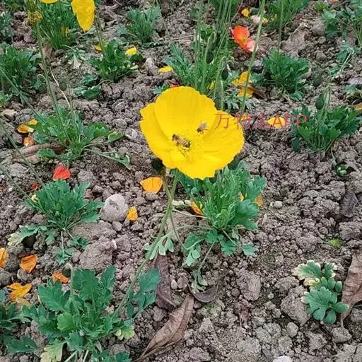 野罂粟(学名:Papaver nudicaule L.):多年生草本。株高20-50厘米,具乳汁,全体被粗毛。叶生基生,具长柄;叶片轮廓卵形或长卵形、狭卵形或披针形,先端钝圆,两面疏生微硬毛。花单独顶生。萼片2,广卵形,被棕灰色硬毛,花开后脱落。花瓣4,桔黄色,倒卵形至宽倒卵形,具微波状缺刻。雄蕊多数,花丝丝状;子房具棱,柱头5-9裂。蒴果,狭倒卵形,密被视而长的硬毛,顶孔开裂。种子细小,多数。花期6-7月,果期8月。