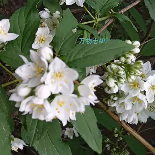 1)重瓣溲疏(cv.plena)。叶具圆钝细锯齿。花蕾外有红晕,花重瓣,开放后花瓣白色,外轮花瓣外面染淡紫红色。