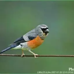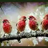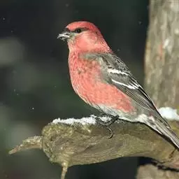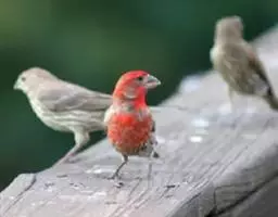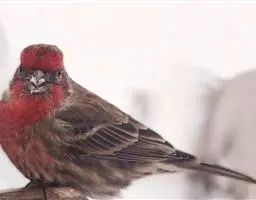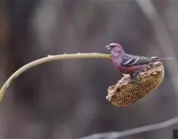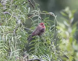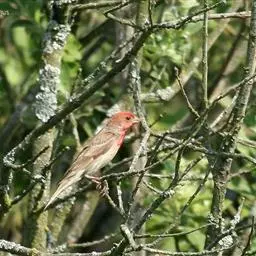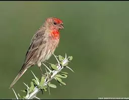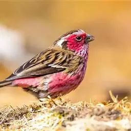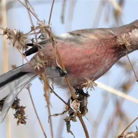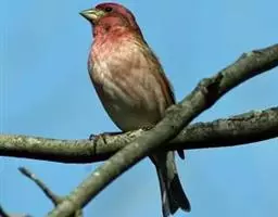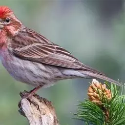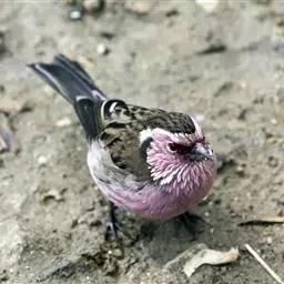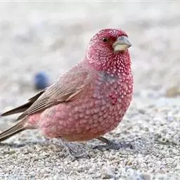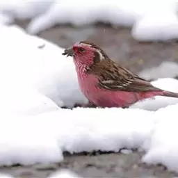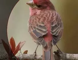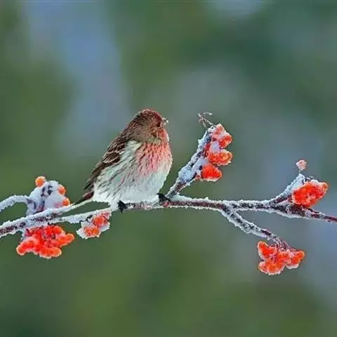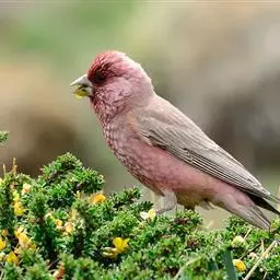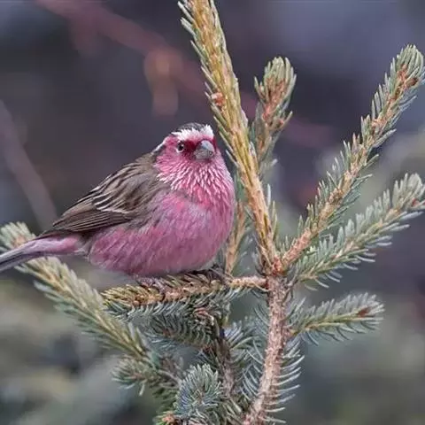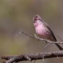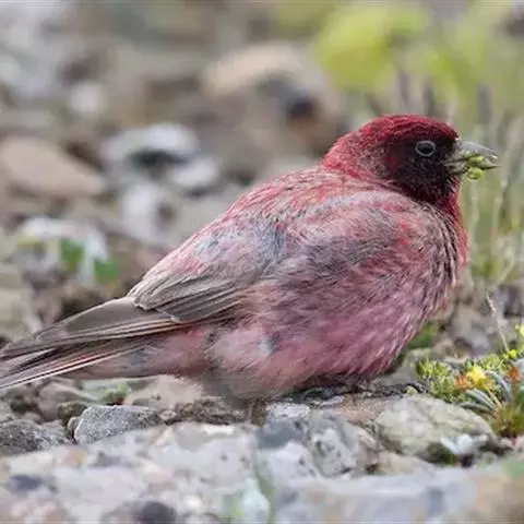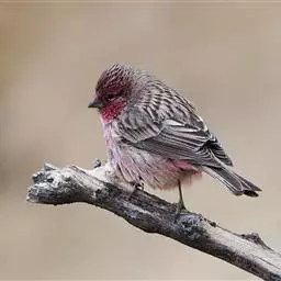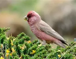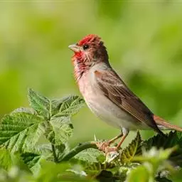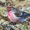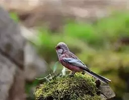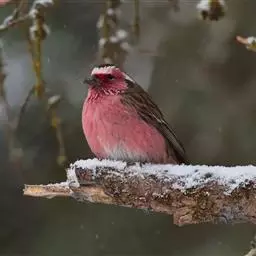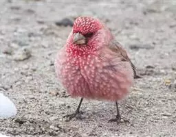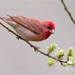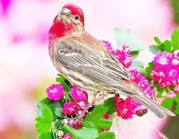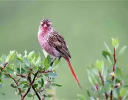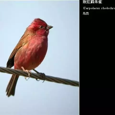 红腰朱雀:体长12-14厘米,小型鸟类。雄鸟前额和眉纹玫瑰粉红色,头顶和一宽的贯眼带深红褐色,背红…