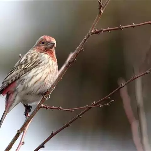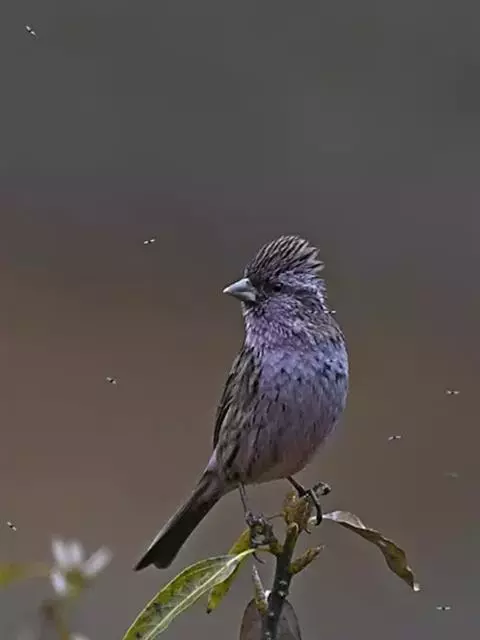 红眉朱雀:体长15厘米,是一种中等体型的朱雀。上体褐色斑驳,眉纹、脸颊、胸及腰淡紫粉,臀近白。…