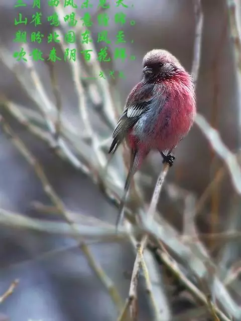 长尾朱雀:体长18厘米,体重16-26克。雄鸟额、颏和眼后为暗红色,…