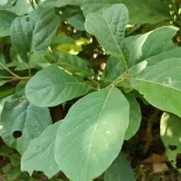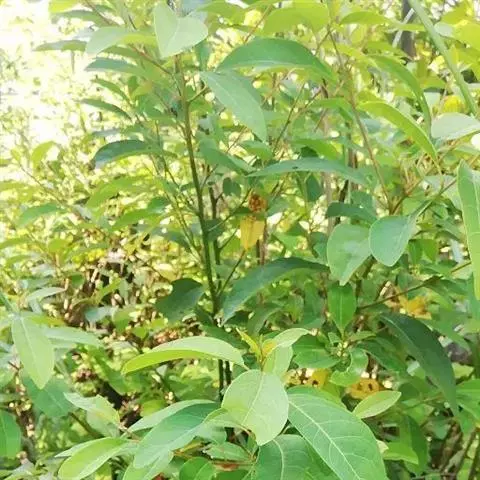 落叶灌木或小乔木,高达4米;树皮绿色,光滑,有黑斑,撕破有松节油气味。顶芽圆锥形,鳞片外面有柔毛。小枝灰褐色,有柔毛。叶互生或聚生枝顶,长圆形或椭圆形,长4-12厘米,宽2-4.8厘米,先端突尖,基部楔形,纸质,上面暗绿色,无毛,下面带绿苍白色,密被白色柔毛,羽状脉,侧脉每边6-9条,纤细,中脉在叶两面突起,侧脉在上面微突,在下面突起,叶柄长1-1.5厘米,被白色柔毛。