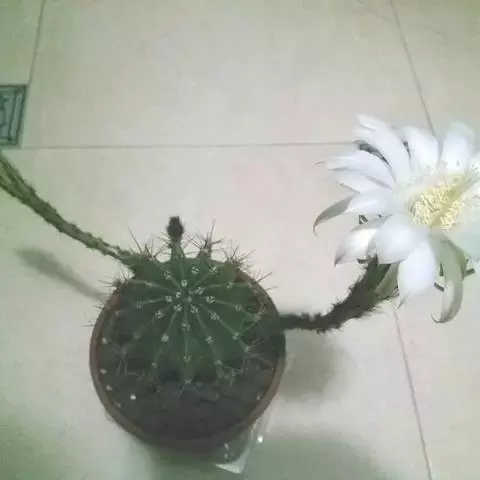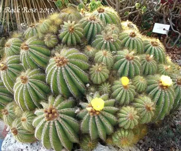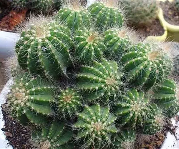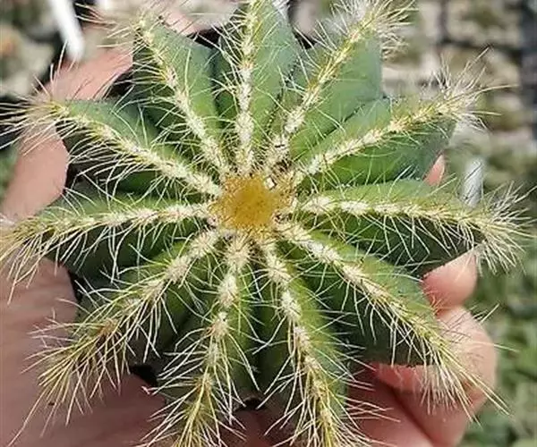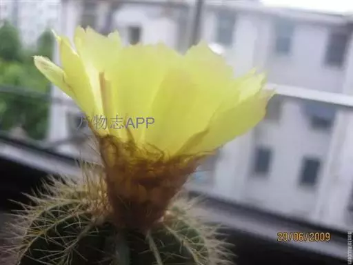 多年生肉质植物,茎幼时球形,后随年龄增长渐变为圆筒形,直径20cm,高可达5m以上,易群生,蓝绿色,棱11—15。茎 顶密生绒毛。刺座密集,放射状刺12—15,毛状,黄白色,中刺8—12,针状,褐色。两种刺长均为约0.5cm—0.8cm。花大,直径达5cm—6cm,花冠漏斗状,鹅黄色。花期6—7月。