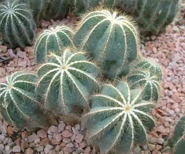 英冠玉初球状单生,后圆筒状并且群生,表皮蓝绿色,顶部密生白色绒毛,棱11~15。刺座密集,周刺12~15,黄白色毛状;中刺8~12,针状褐色,所有刺仅0.5~0.8cm长。漏斗状花5cm大,硫磺色,雄蕊雌蕊都为黄色。