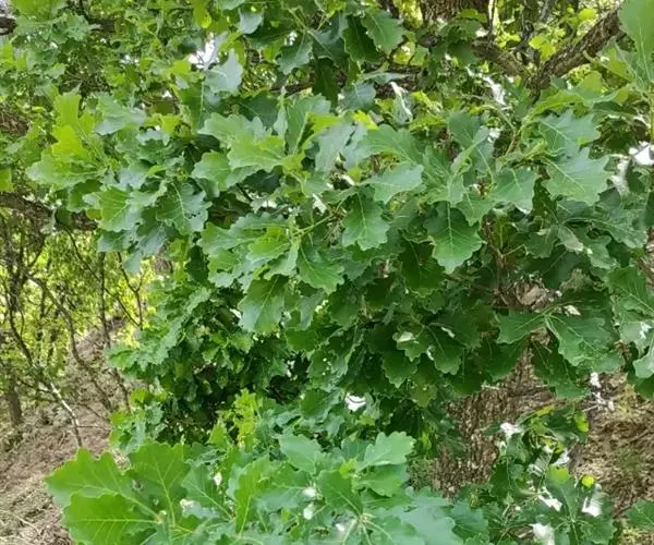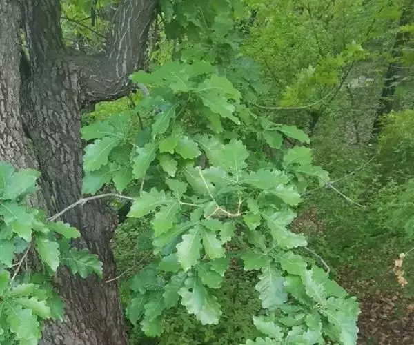 落叶乔木,叶子长椭圆形,结球形坚果,叶可喂蚕;木材坚硬,可制家具,供建筑用,树皮可鞣皮或做染料。亦称“麻栎”、“ 橡 ”;通称“柞树”。