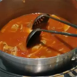 7.放入干红辣椒炸香,放入豆瓣酱,炒出红油,加入肉汤或者清水,同时放入打好的葱结,放入鱼头和鱼骨烧开。