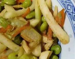 2.锅中掺适量混合油,将老姜、大蒜、豆瓣煸香,再将黄豆芽倒入翻炒入味,盛于盆(钵)中待用。