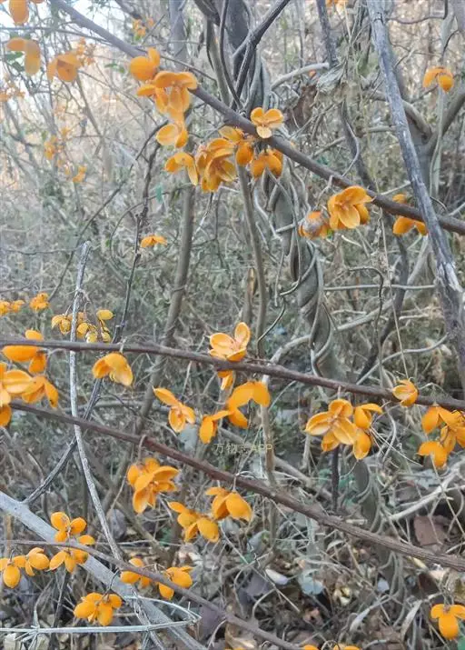 南蛇藤在藤本植物中属大型藤本植物,以周边植物或山体岩石为攀援对象,远望形似一条莽蛇在林间、岩石上爬行,蜿蜒曲折,野趣横生。