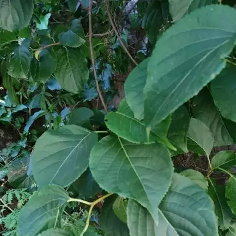叶通常阔倒卵形,近圆形或长方椭圆形,长5-13厘米,宽3-9厘米,先端圆阔,具有小尖头或短渐尖,基部阔楔形到近钝圆形,边缘具锯齿,两面光滑无毛或叶背脉上具稀疏短柔毛,侧脉3-5对;叶柄细长1-2厘米。