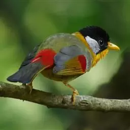 银耳相思鸟小型鸟类,体长14~18厘米。头顶黑色,耳羽银灰色,前额橙黄色;外侧飞羽橙黄色,基部朱红色,…