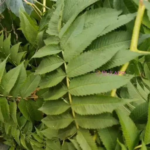 羽状复叶,小叶片11-17枚,连叶柄长13-23厘米,宽10-13厘米,叶轴微被短柔毛;小叶片对生,相距2-2.5厘米,披针形至卵状披针形,长5-7厘米,宽1.8-2.5厘米,先端渐尖,稀尾尖,基部近圆形或宽楔形,稀偏斜,边缘有尖锐重锯齿,上下两面无毛或近于无毛,羽状网脉,具侧脉12-16对,下面明显;小叶无柄或近于无柄;托叶叶质,卵状披针形至三角披针形,先端渐尖至急尖,边缘有不规则锯齿或全缘,长8-13毫米,宽5-8毫米,外面微被短柔毛。