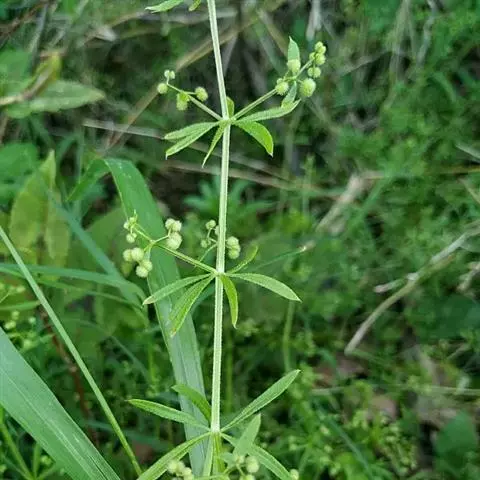 六叶葎 Ehrend. & Schönb.-Tem. ex R. R. Mill)是茜草科拉拉藤属的一年生草本。常直立,有时披散状,高10-60厘米左右,近基部分枝,有红色丝状的根;茎直立,具疏短毛或无毛;叶片薄,纸质或膜质,长圆状倒卵形、倒披针形、卵形或椭圆形顶端钝圆而具凸尖;聚伞花序顶生和生于上部叶腋,苞片常成对披针形,花冠白色或黄绿色,裂片卵形,雄蕊伸出;果近球形,单生或双生,密被钩毛;花期4-8月;果期5-9月。六叶葎分布于中国北、山西、陕西、甘肃、江苏、安徽、浙江、江西、河南、湖北等地,印度、巴基斯坦、尼泊尔、锡金、不丹、缅甸、日本、朝鲜、俄罗斯均有栽培。生于海拔920-3800米的山坡、沟边、河滩、草地的草丛或灌丛中及林下。六叶葎味甘,性平,具有清热解毒、利尿消肿的功效,可用于治疗尿路感染、赤白带下、痢疾、痛肿、跌打