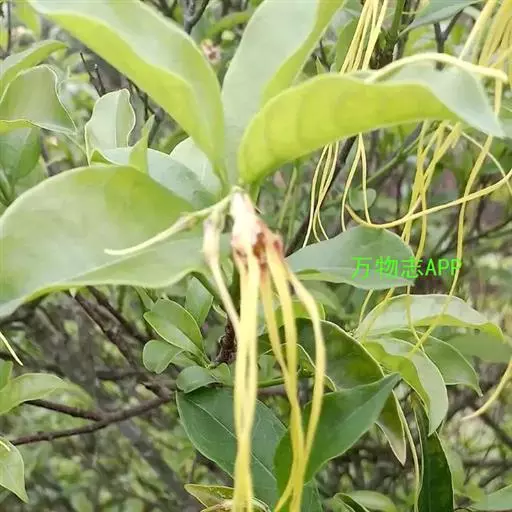 叶薄纸质,椭圆状长圆形或椭圆形,长3-10厘米,宽1.5-5厘米,顶端短渐尖或急尖,基部楔形,边缘全缘或有时略带微波状,叶面深绿色,叶背浅绿色,两面无毛;中脉在叶面扁平或凹陷,在叶背略凸起,侧脉通常每边6条,斜曲上升,叶缘前网结;叶柄短,长5毫米。