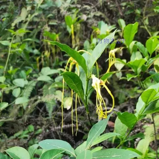 聚伞花序顶生,通常着花3朵,无毛;总花梗长0.51.5厘米;花梗长0.5-1厘米;苞片和小苞片线状披针形,长5-10毫米;花黄色;花萼筒长5毫米,萼片披针形,长8-9毫米,基部宽2毫米,顶端长渐尖,绿色或黄绿色,内面基部有腺体;花冠漏斗状,花冠筒淡黄色,长1.2-1.5厘米,下部圆筒状,上部渐扩大呈钟状,内面被疏短柔毛,花冠裂片黄色外弯,基部卵状披针形,顶端延长成一长尾带状,长达10厘米,基部宽0.4-0.5厘米,裂片内面具由10枚舌状鳞片组成的副花冠,高出花冠喉部,白黄色,鳞片每2枚基部合生,生于花冠裂片之间,顶部截形或微凹,长3毫米,宽1毫米;雄蕊内藏,着生在冠檐基部,花丝延长至花冠筒上呈肋状凸起,被短柔毛,花药箭头形,基部具耳,药隔顶部渐尖成一尾状体,不伸出花冠喉部,各药相连,腹部粘于柱头上;子房半下位,由2枚离生心皮组成,无毛,花柱圆柱状,柱头棍棒状,顶端浅裂,每心皮有胚珠多颗;无花盘。