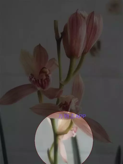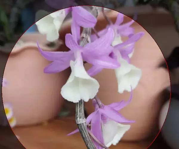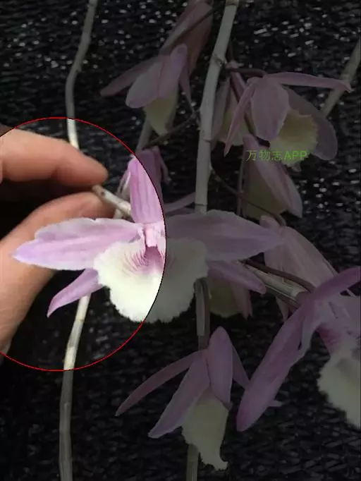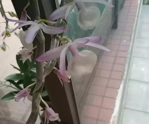总状花序几乎无花序轴,每1-3朵花为一束,从落了叶或具叶的老茎上发出;花序柄长约2-5毫米,基部被3-4枚鞘;鞘膜质,长2-3毫米;花苞片浅白色,膜质,卵形,长约3毫米,先端急尖;花梗和子房暗褐色带绿色,长2-2.5厘米;花开展,下垂;萼片和花瓣白色带淡紫红色或浅紫红色的上部或有时全体淡紫红色;中萼片近披针形,长2.3厘米,宽5-6毫米,先端近锐尖,具5条脉;侧萼片相似于中萼片而等大,先端急尖,具5条脉,基部歪斜;萼囊狭圆锥形,长约5毫米,末端钝。
