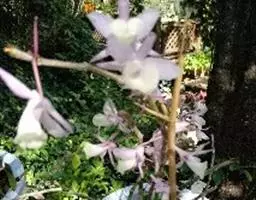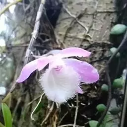兜唇石斛(学名:Dendrobium aphyllum (Roxb. ) C. E. Fischer):茎下垂,肉质,细圆柱形,不分枝,具多数节。叶纸质,二列互生于整个茎上,披针形或卵状披针形。总状花序几乎无花序轴,每1-3朵花为一束,从落了叶或具叶的老茎上发出;花开展,下垂;萼片和花瓣白色带淡紫红色或浅紫红色的上部或有时全体淡紫红色;花瓣椭圆形,长2.3厘米,宽9-10毫米,先端钝,全缘,具5条脉;唇瓣宽倒卵形或近圆形。蒴果狭倒卵形,具长约1-1.5厘米的柄。花期3-4月,果期6-7月。
