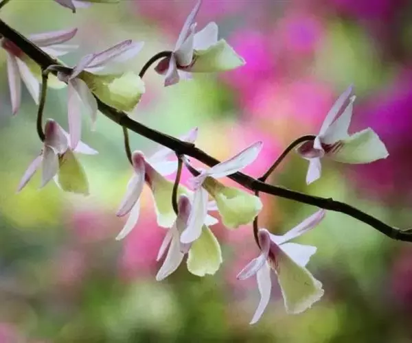 玫瑰石斛是兰科石斛属的多年生附生草本植物。茎斜下或下垂,青绿色,圆柱形,…