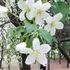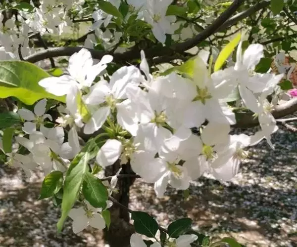 海棠花(学名:Malus spectabilis (Ait.)Borkh):乔木,高可达8米;小枝粗壮,圆柱形,幼时具短柔毛,逐渐脱落,老时红褐色或紫褐色,无毛。叶片椭圆形至长椭圆形,长5-8厘米,宽2-3厘米,边缘有紧贴细锯齿,有时部分近于全缘,幼嫩时上下两面具稀疏短柔毛,以后脱落,老叶无毛。花序近伞形,有花4-6朵,花直径4-5厘米;萼筒外面无毛或有白色绒毛;萼片三角卵形,先端急尖,全缘;花瓣卵形,长2-2.5厘米,宽1.5-2厘米,基部有短爪,白色,在芽中呈粉红色。果实近球形,直径2厘米,黄色。果期8-9月。