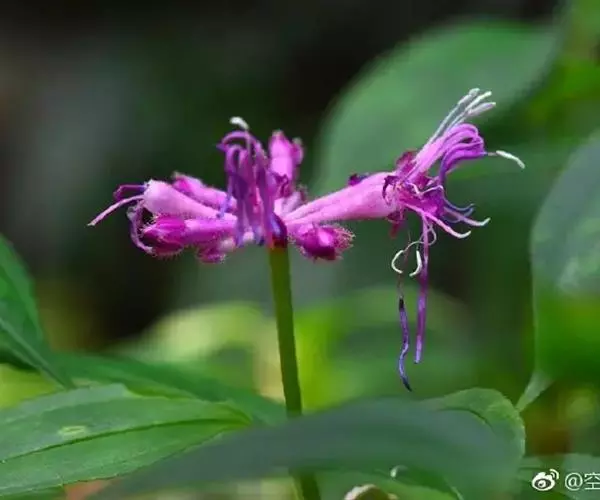 草本或亚灌木,高30-80厘米;茎四棱形,有槽,无毛,不分枝。叶片膜质,通常在一个节上的叶,大小差别较大,广披针形至卵形,稀披针形,顶端渐尖,基部浅心形,稀近楔形,长5-14.5厘米,宽2-5厘米,边缘具不甚明显的细锯齿,5基出脉,叶面被紧贴的;微柔毛,基出脉微凸,侧脉不明显,背面几无毛或被极不明显的微柔毛及白色小腺点,基出,脉明显,隆起,侧脉及细脉不明显;叶柄长1.5-4.3厘米,常被白色小腺点,仅顶端与叶片连接处具短刺毛。不明显的聚伞花序或伞形花序,顶生,总梗长1-3厘米,无毛,基部有1对叶,常早落;伞梗基部具1圈覆瓦状排列的苞片,苞片广卵形或近圆形,通常带紫红色,透明,长约1厘米;花萼长漏斗形,具四棱,长1.4-1.5厘米,被腺毛及白色小腺点,具8脉,其中4脉明显,裂片长三角形或卵状三角形,顶端钝,长约4.5毫米,被疏腺毛及白色小腺点,具腺毛状缘毛;花瓣红色或紫红色,长圆形,顶端偏斜,具腺毛状小尖头,长约1.1厘米,外面被紧贴的疏糙伏毛及白色小腺点;雄蕊长者花丝长约1.1厘米,花药线形,长约1.5厘米,弯曲,基部呈羊角状伸长;短者花丝长约7毫米,花药长圆形,长约3毫米,基部不呈羊角状;子房顶端具膜质冠,冠檐具缘毛。蒴果倒圆锥形,顶孔4裂,最大处直径约5毫米;宿存萼与蒴果同形,具不明显的8条纵肋,无毛,膜质冠伸出萼外,4裂。花期8-9月,果期约6月。