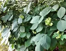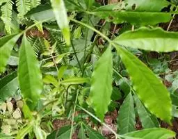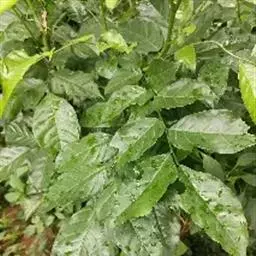 叶对生,叶轴长9-17厘米,淡灰褐色,无毛,小叶3,稀为5,纸质,长圆状椭圆形或长卵形,长(6~)8~10厘米,宽(2.5~) 3.5~4.5厘米,先端长渐尖,基部宽楔形,边缘微反折,具锯齿,上面深绿色,无毛,背面色淡,向基部脉腋(中脉两侧)疏生白色微柔毛,余无毛,主脉在两面明显,侧脉6~7,与网脉在两面明显,侧、叶柄长经尧望篡半,中、叶柄长(1~)2.5~3.5厘米。