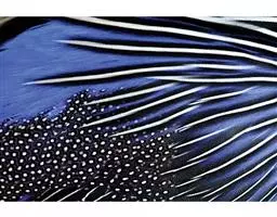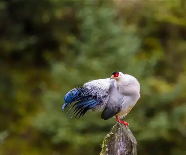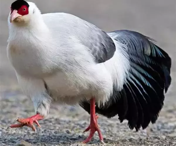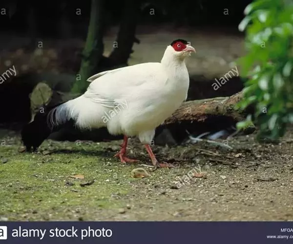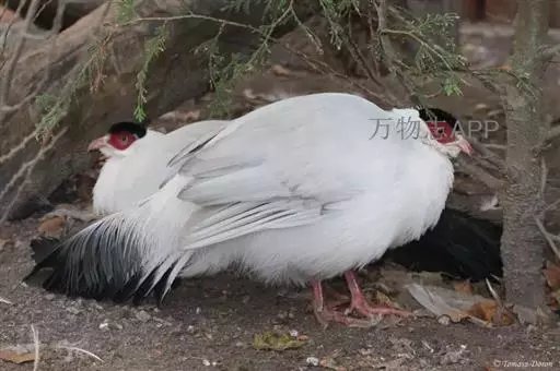 白马鸡雄鸟头顶密被以黑色绒羽状短羽;耳羽簇白色,向后延伸成短角状,但不突出于头上。上下体羽几纯白色,羽端分散呈发丝状。背微沾灰色;颏、喉沾棕,较长的尾上覆羽和翅上覆羽稍沾暗灰色,初级覆羽内翈暗褐色;外翈暗灰褐色而具白色羽缘,次级飞羽黑褐色而具紫色光彩;初级飞羽和小翼羽暗褐褐色;尾特长,辉绿蓝色,基部灰色,末端具带金属光泽的暗绿和蓝紫色;中央一、二对尾羽大部羽枝分散下垂。 雌鸟和雄鸟相似,但体型稍小,羽色较暗淡。 虹膜橙黄色,脸部裸出,呈鲜红色,具疣状小突;嘴粉红色;脚,趾红色,爪角色。雄鸟具距。