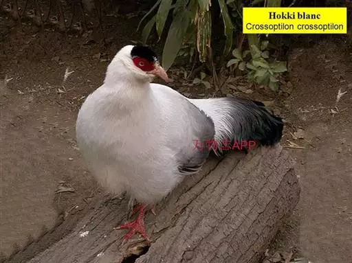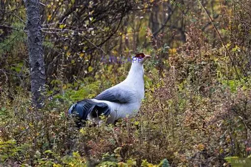 白马鸡(学名:Crossoptilon crossoptilon)共有四个亚种。是大型雉,体长80-100厘米。通体大都白色,头侧绯红色;头顶具黑色短羽,耳羽簇白色,呈短角状。胸淡灰色或白色,飞羽灰褐色,尾羽特长,大都辉绿蓝色,末端沾紫色光泽,羽枝大都分离,披散而下垂。