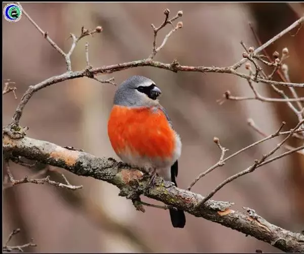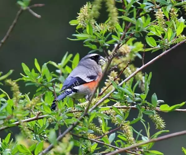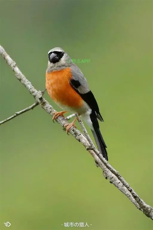 体型略大(17厘米)而厚实的灰雀。嘴厚略带钩。似其他灰雀但成鸟的头灰色。雄鸟胸及腹部深橘黄色。雌鸟下体及上背暖褐色,背有黑色条带。幼鸟似雌鸟但整个头全褐色,仅有极细小的黑色眼罩。飞行时白色的腰及灰白色的翼斑明显可见。