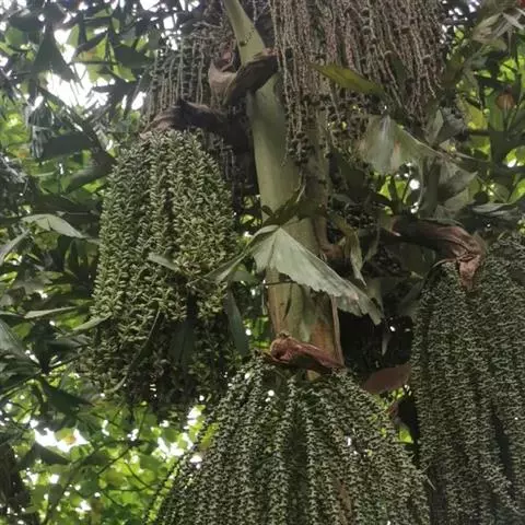 酒椰,茎直立,中等乔木状,高达5-10米。叶为羽状全裂,全长12-13米;羽片线形,长1.2-2米…