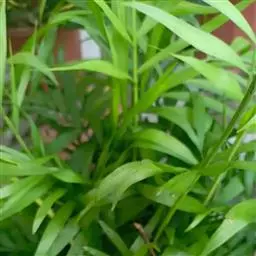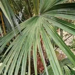 细叶棕竹,灌木,茎细如竹,多数聚生,有网状叶鞘。叶半圆形,掌状深裂,裂片狭长,阔线形,软垂,裂片7…