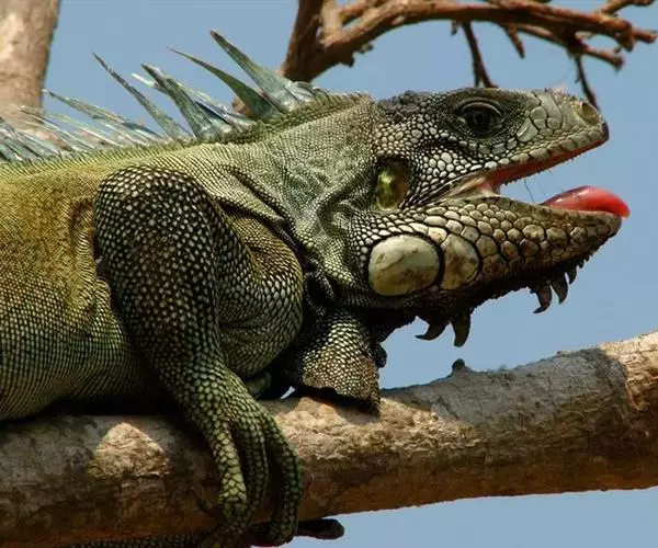 绿鬣蜥的其他显着特征包括喉咙下的颈下垂皮,由从中颈到尾巴基部延伸的真皮刺组成的背顶,以及长长的逐渐变细的尾巴。成年雄性比雌性的颈下垂皮更发达。舌骨的延长使这一结构的前缘变硬并得到支撑,该前缘用于领土防御或对其他动物进行恐吓。这种肉质结构在伸展时也起到吸热和散热的作用。