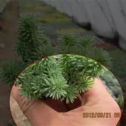 薄雪万年草别名矶小松,景天科景天属多年生草本植物,其细小的蓝绿色棒状叶片环绕生长于茎端,…