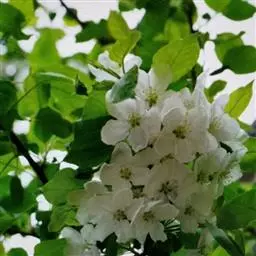 花5-15朵,成伞形伞房状花序;花直径3-4厘米;花梗和萼筒无毛,有时具腺毛,萼片披针形,先端渐尖,全缘,有少数裂片,外面近无毛而有稀疏腺点,内面有长柔毛;花瓣白色,宽倒卵形,先端微凹,基部宽楔形;花柱结合成柱,被柔毛,比雄蕊稍长。果近球形,直径8-10毫米,成熟后褐红色,有光泽,果梗有稀疏腺点;萼片脱落。