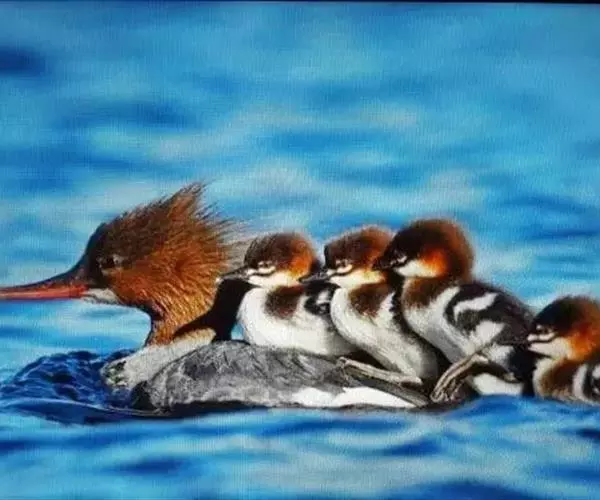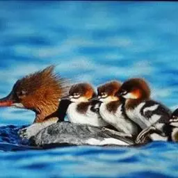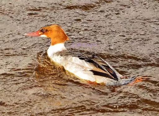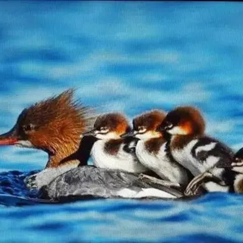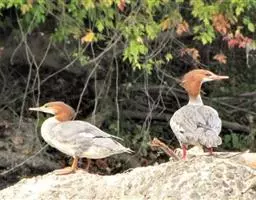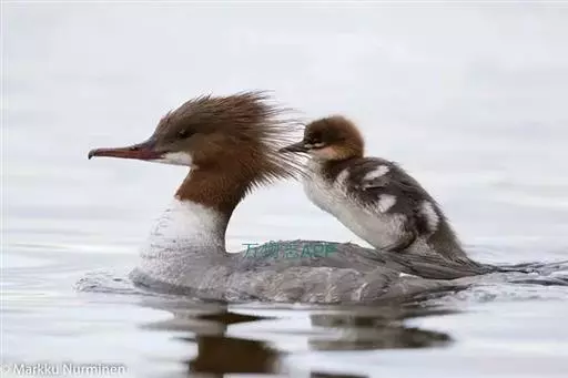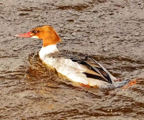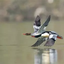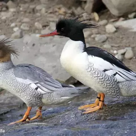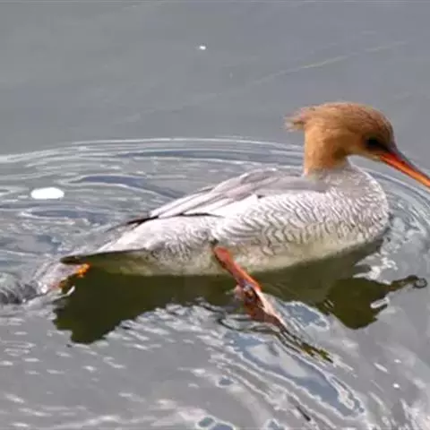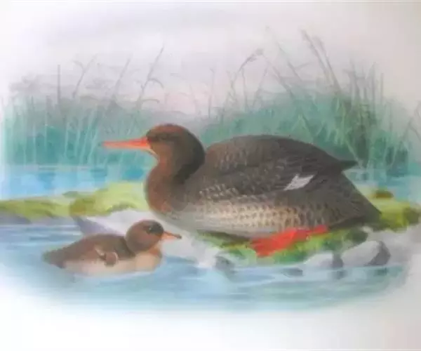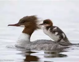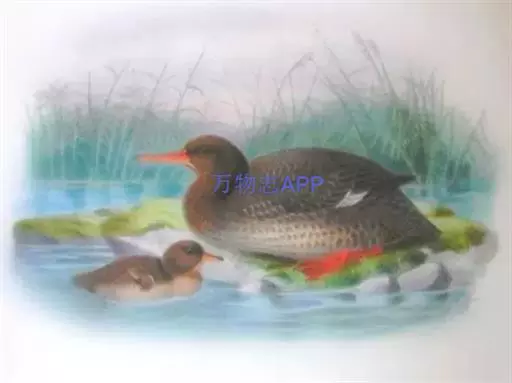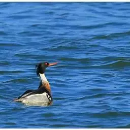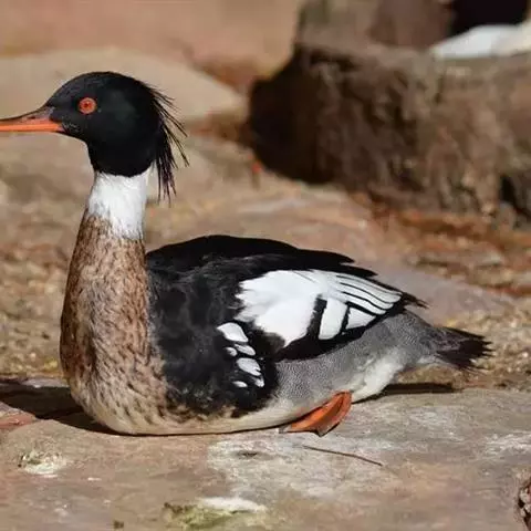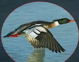 红胸秋沙鸭(学名:Mergus serrator)属中等食鱼鸭类,体长53厘米。嘴细长而带钩,捕食鱼类。丝质冠羽长而尖。雄鸟黑白色,两侧多具蠕虫状细纹。雌鸟及非繁殖期雄鸟色暗而褐,近红色的头部渐变成颈部的灰白色。生活于河流,湖泊,海洋,苔原。常成家族群或小群迁飞,偶尔也见有单只的。食物主要为小型鱼类,也吃水生昆虫、昆虫幼虫、甲壳类、软体动物等其他水生动物。偶尔也吃少量植物性食物。分布于全北界、印度、中国,越冬于东南亚。