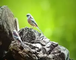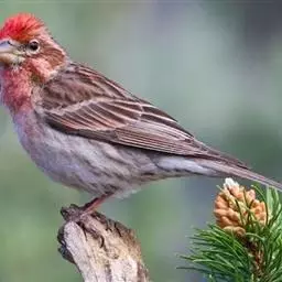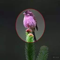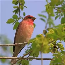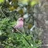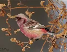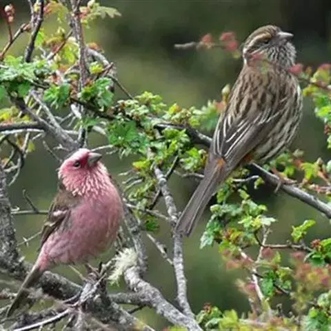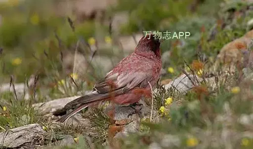 红腰朱雀:体长12-14厘米,小型鸟类。雄鸟前额和眉纹玫瑰粉红色,头顶和一宽的贯眼带深红褐色,背红…